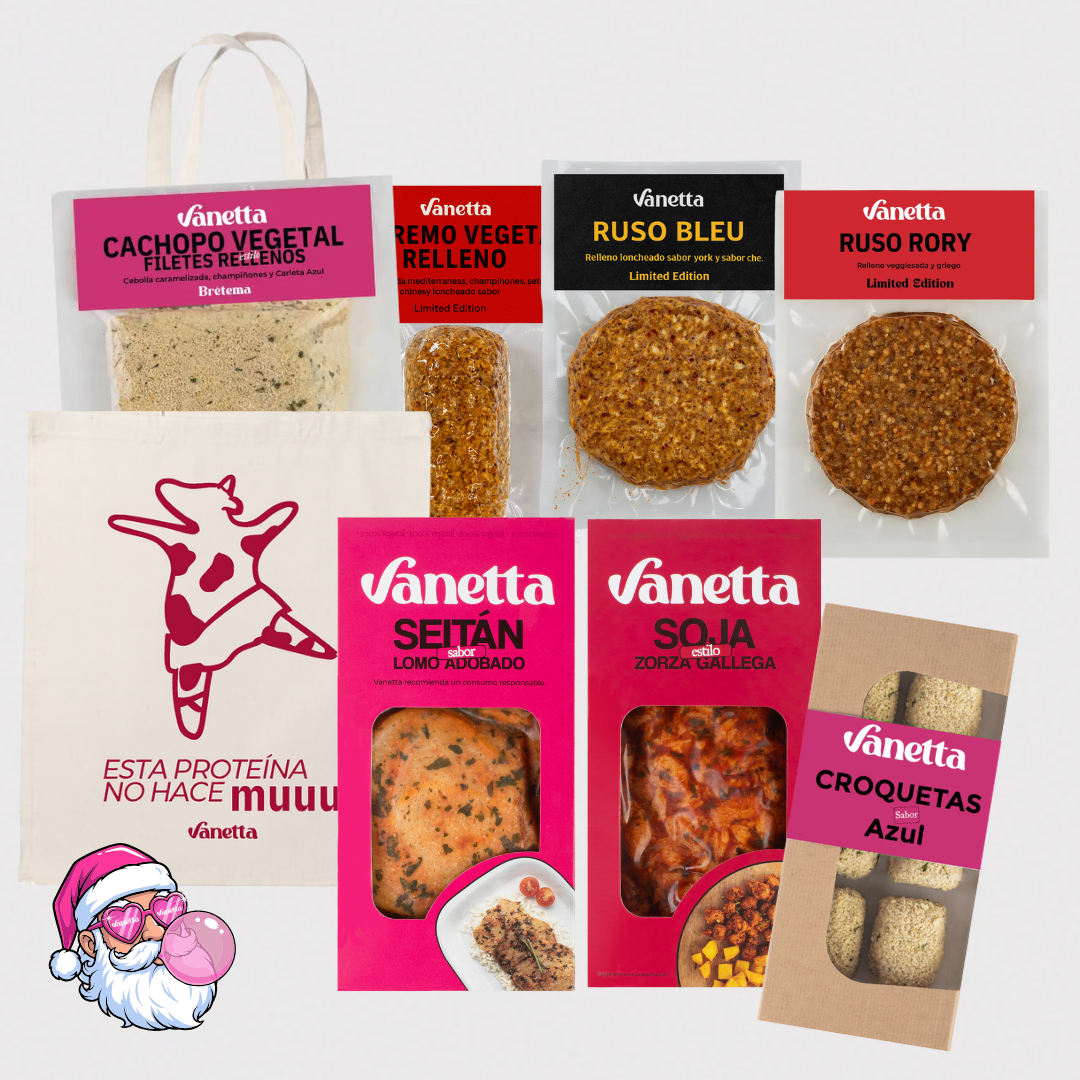 Descubre el regalo más sabroso de estas fiestas: nuestro Pack Navidad Vanetta. Una edición especial que reúne lo mejor de nuestra cocina vegetal: 5 productos exclusivos navideños y 2 clásicos infalibles, todos elaborados sin ingredientes de origen animal, con el sabor de siempre y el punto gamberro que nos caracteriza.